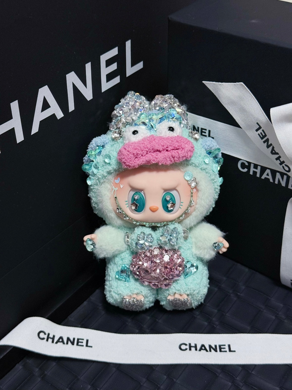 This authentic standing Labubu doll charm is a luxurious collectible for true fans. Made with a soft vinyl face and plush body, each piece is individually handmade and decorated with real Swarovski crystals. Modified from official figures, no two are ever the same — each one is truly one-of-a-kind.